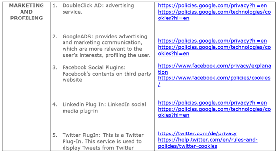 - Third party cookies for profiling and marketing: these are set by a website other than the one the user is actually visiting. While navigating the site, the user may also receive cookies sent from other websites or web servers (so-called "third parties"), which may contain certain elements (including, for example, images, maps, sounds, specific links to pages from other domains) present on the website the user is visiting. These cookies allow you to interact through your social account with this Site and to share with your friends/followers your interests. These cookies are not needed to surf this Site. Legal Grounds as described in the table below, data retention period set by each third party.