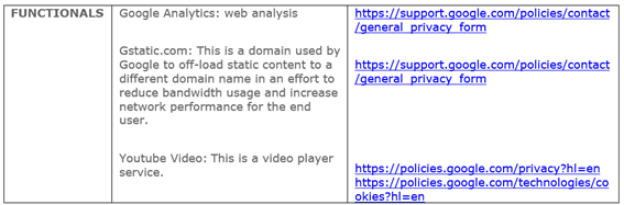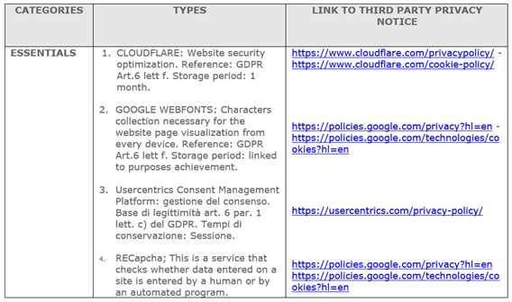 - Third Parties Essential Cookies: these are set by a website other than the one the user is actually visiting but this Site needs them to function. Legal Grounds and data retention as described in the table below.